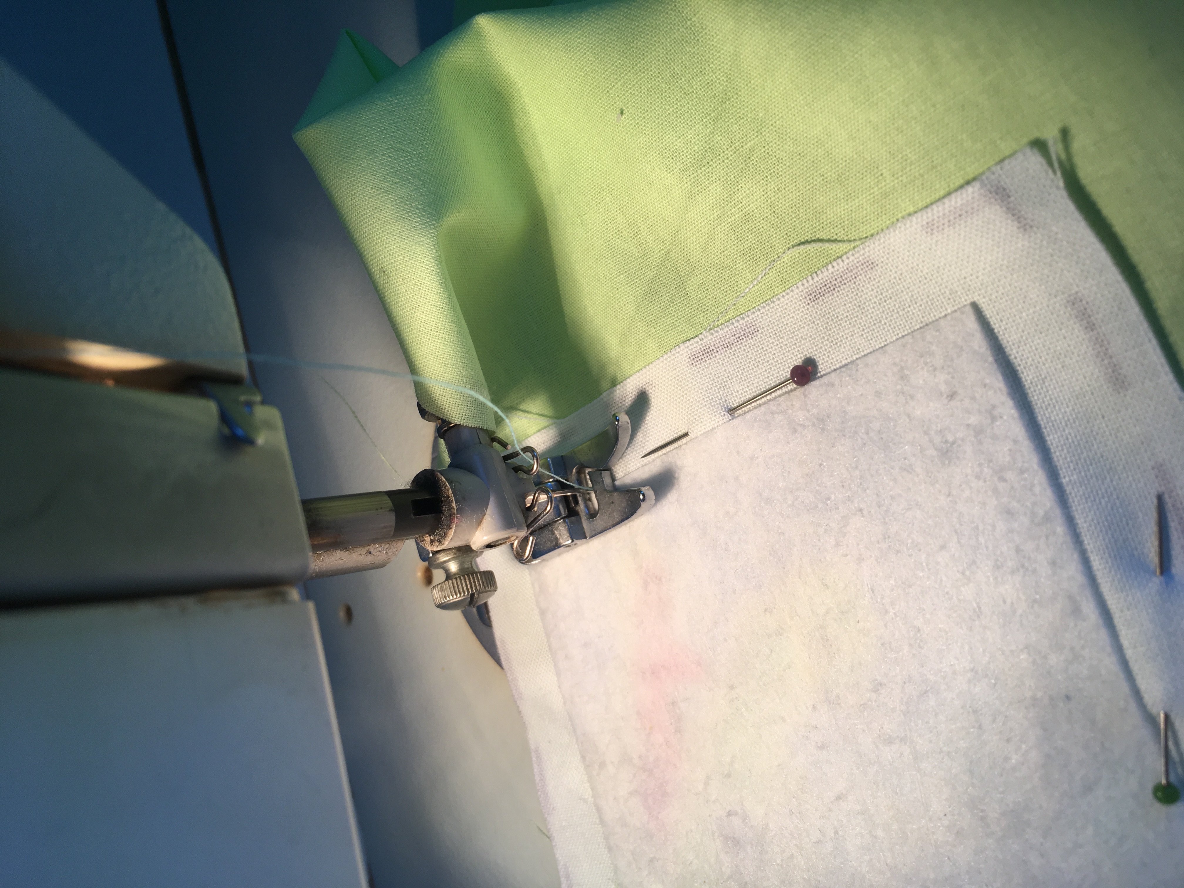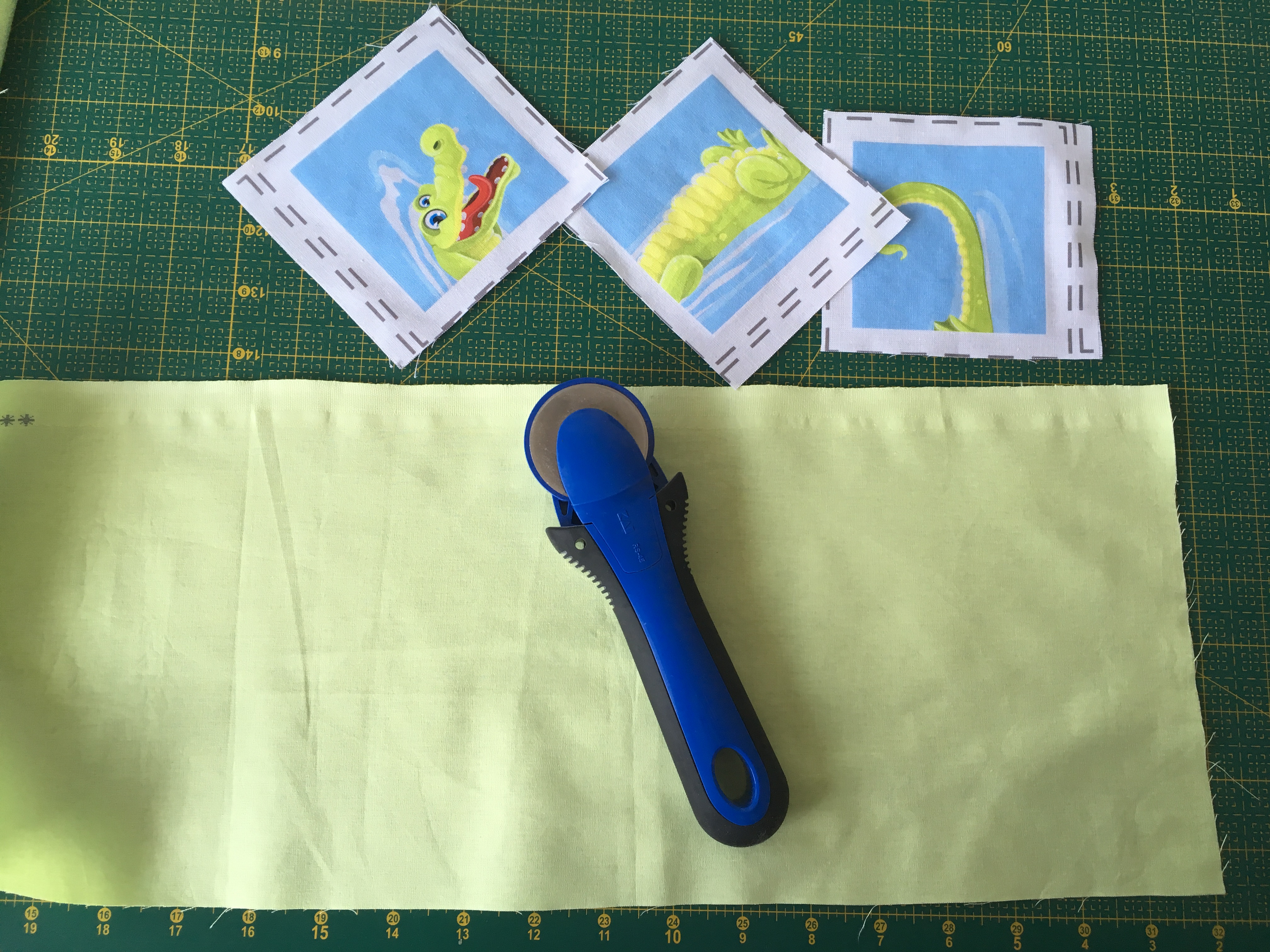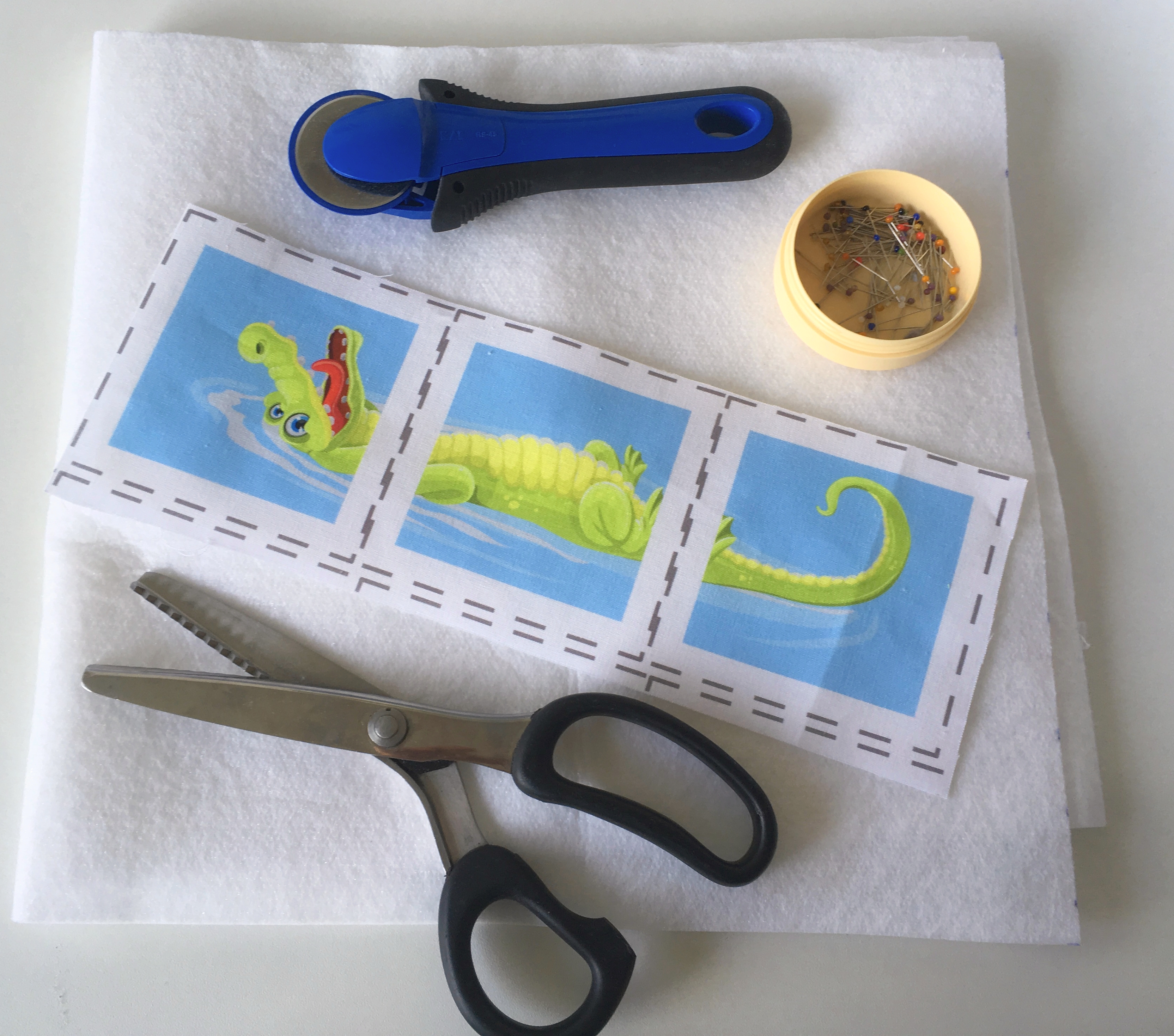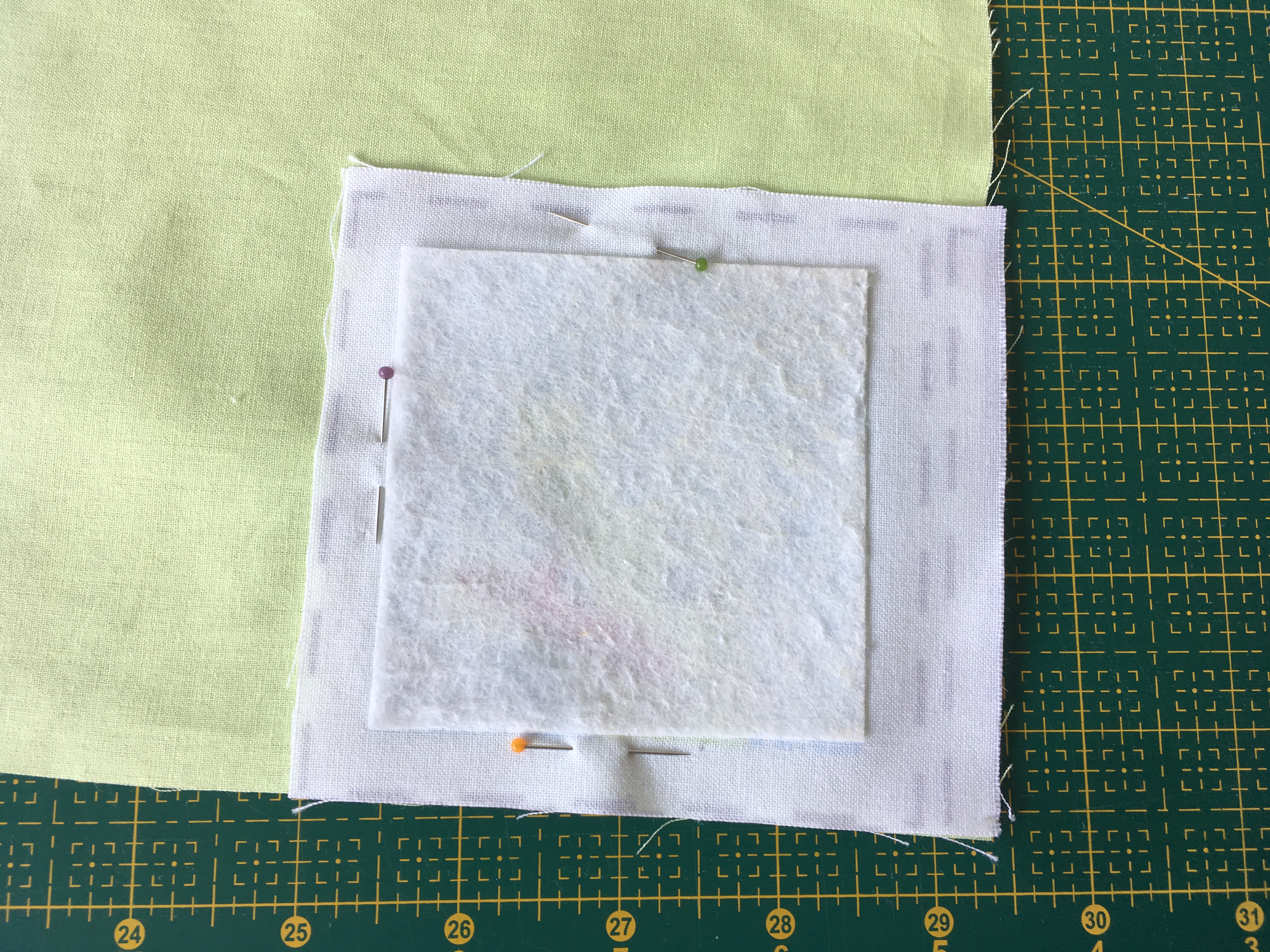 Nyní nás čeká špendlení. Pokud máte malý kousek plátna jako já, můžete špendlit rovnou na něj. Pokud máte veliký rozměr, ustřihněte si čtverečky o rozměru cca 10x10 cm.