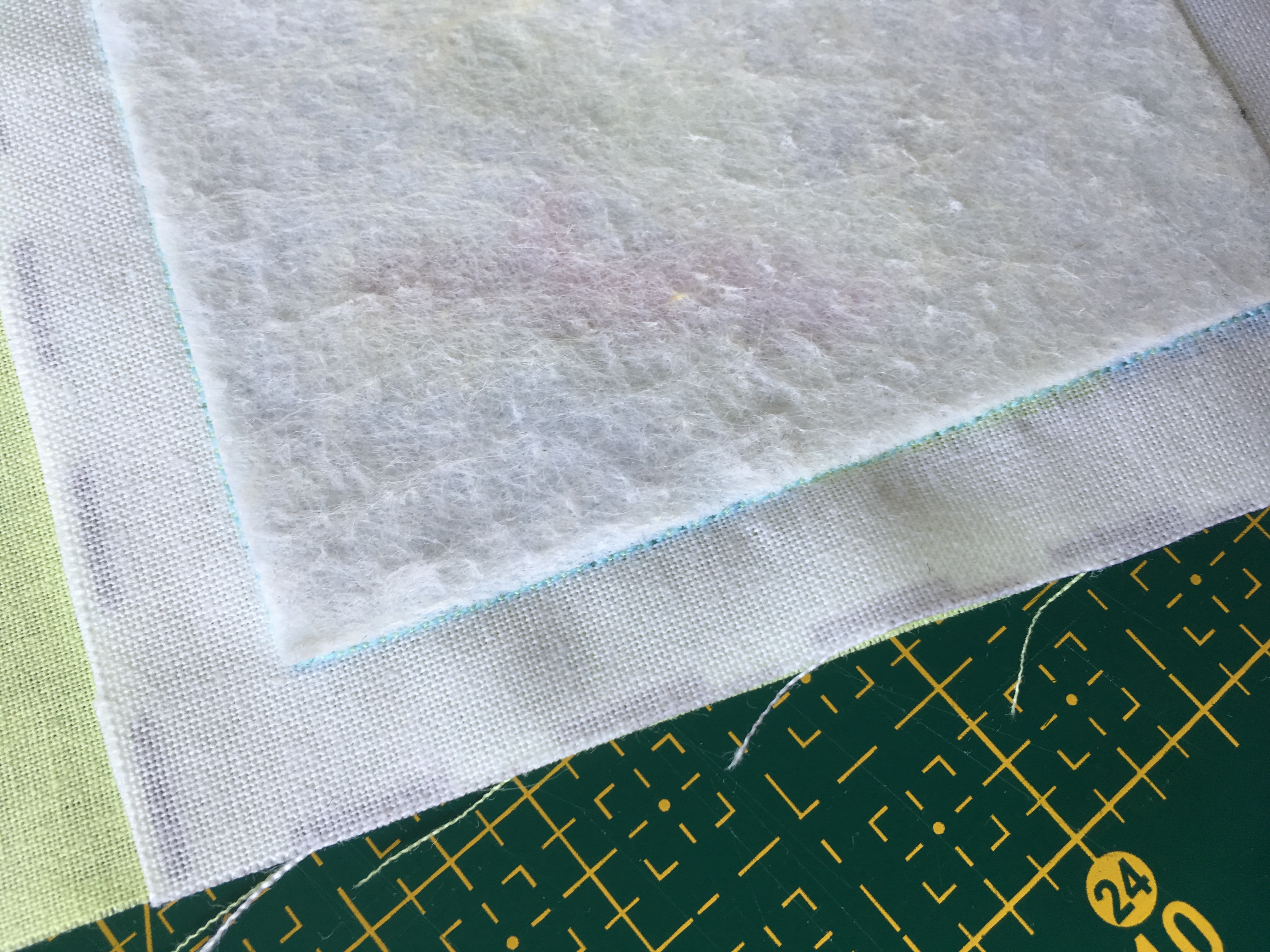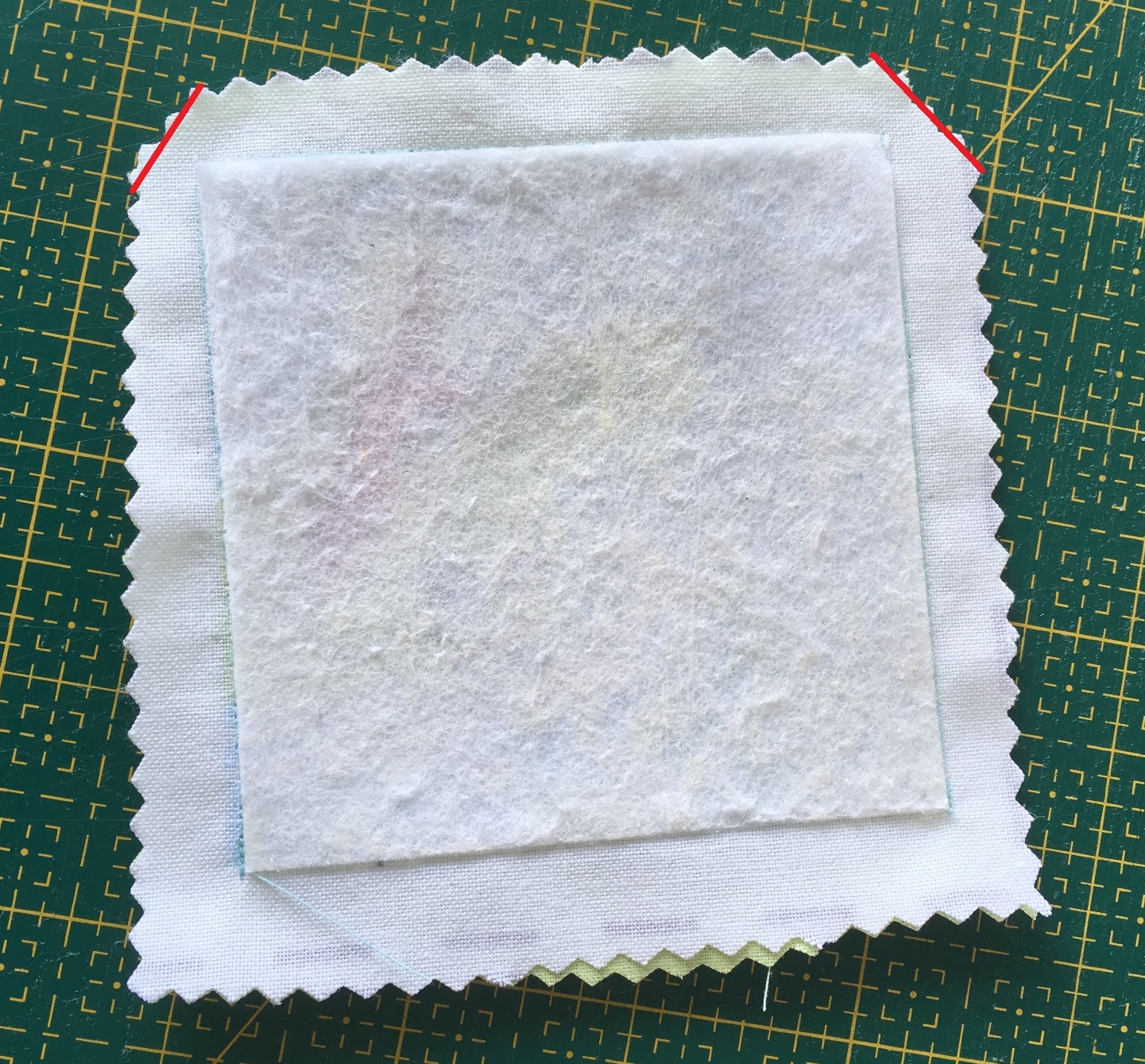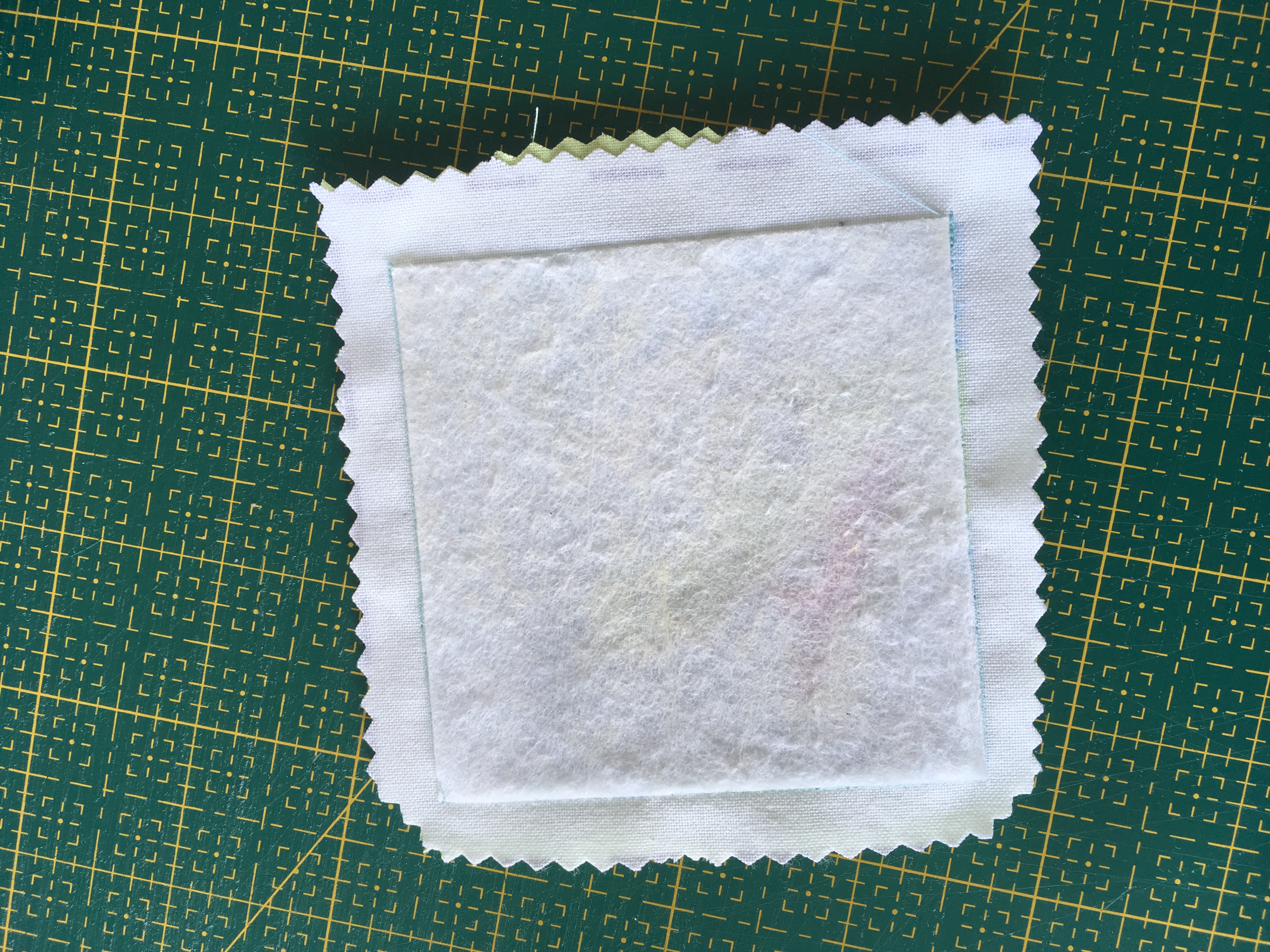 Tip: Pokud nemáte v plánu později používat entlovací nůžky, je teď správný čas začistit si okraje jak čtverečku plátna, tak vyztuženého čtverečku panelu. Stačí začistit u obojího pouze 1 strana a zbylé 3 začistíte společně po sešití.