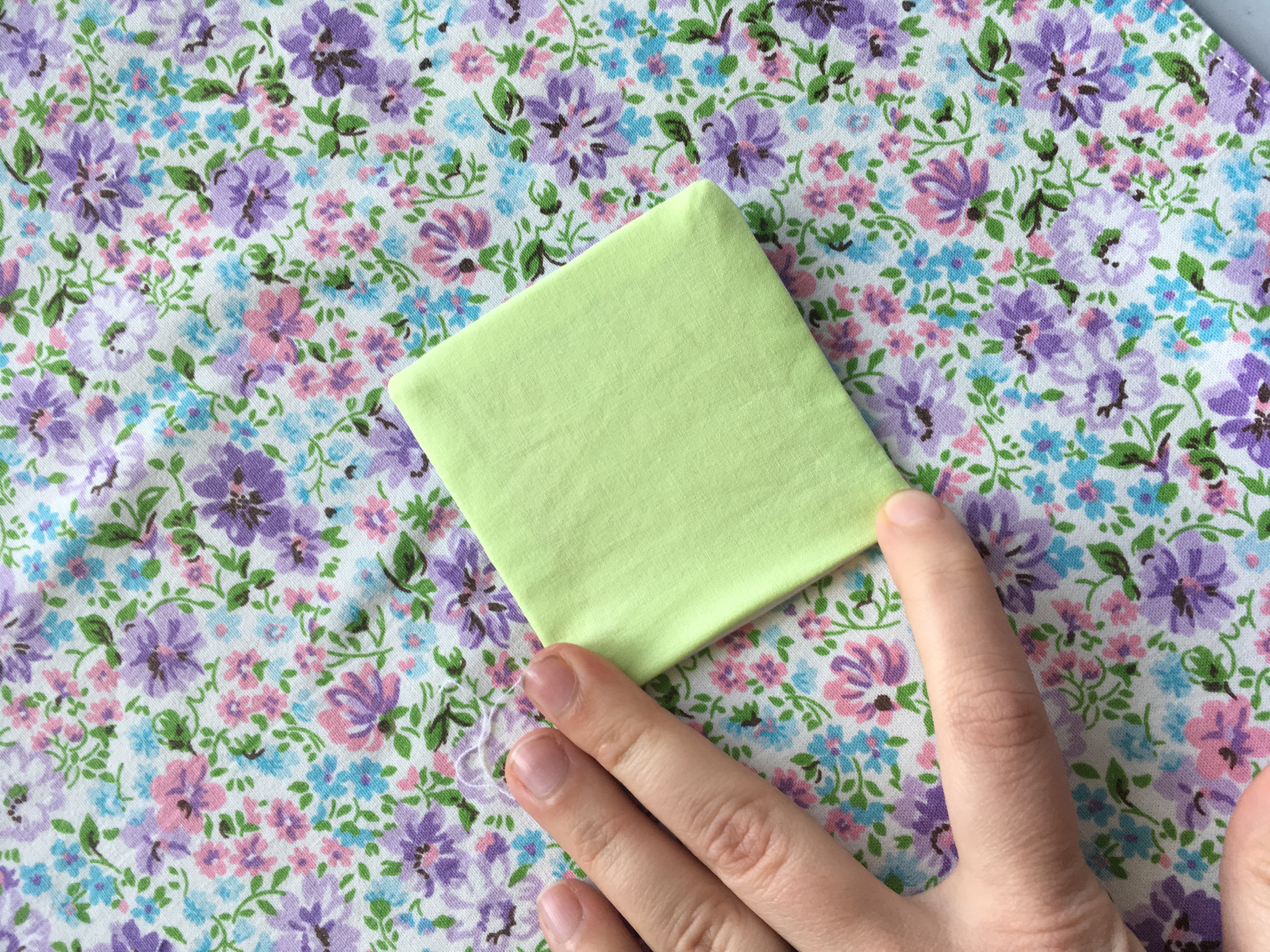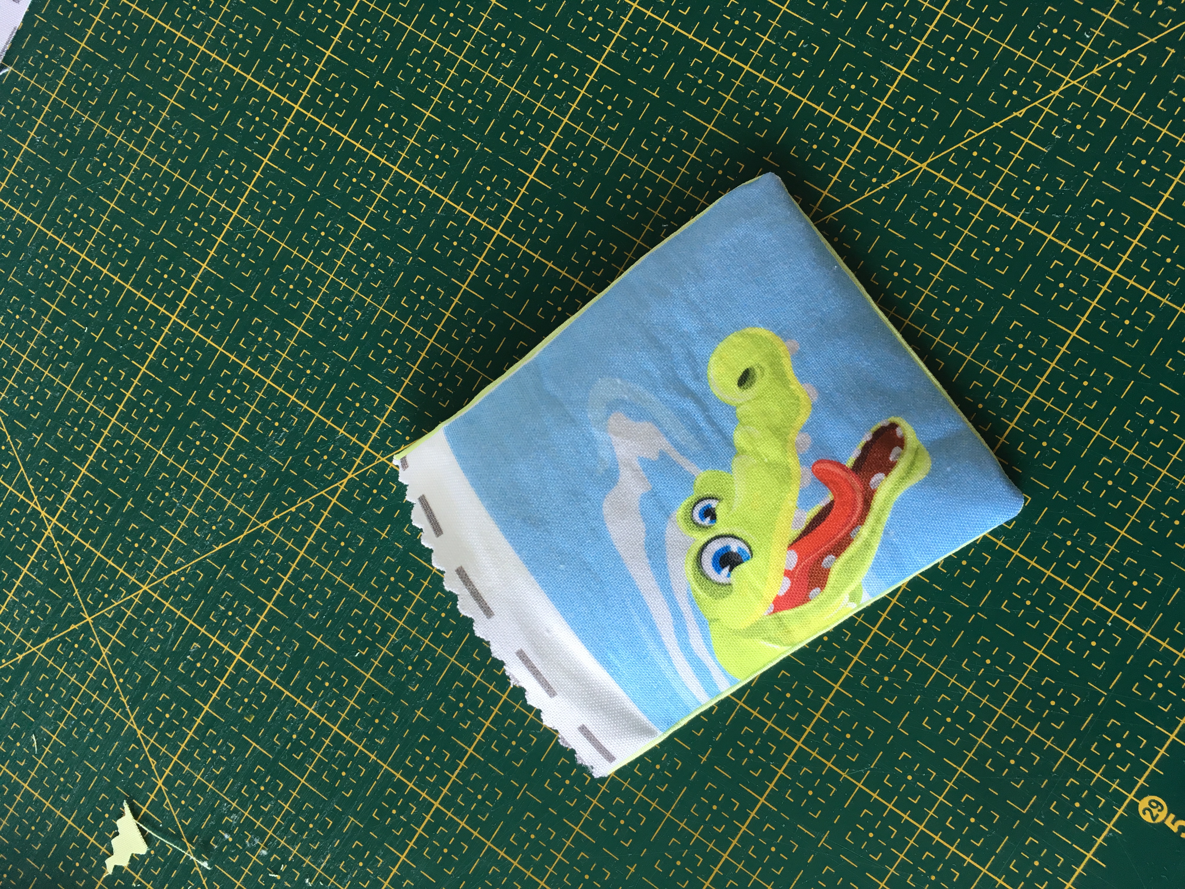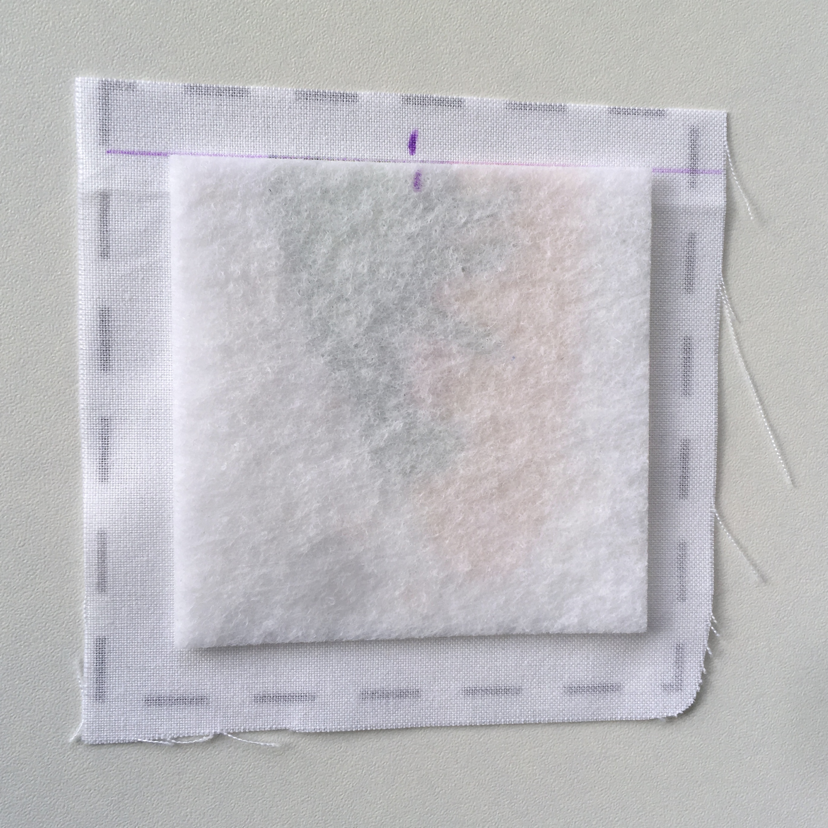 Tip: Pokud nemáte v plánu později používat entlovací nůžky, je teď správný čas začistit si okraje jak čtverečku plátna, tak vyztuženého čtverečku panelu. Stačí začistit u obojího pouze 1 strana a zbylé 3 začistíte společně po sešití.