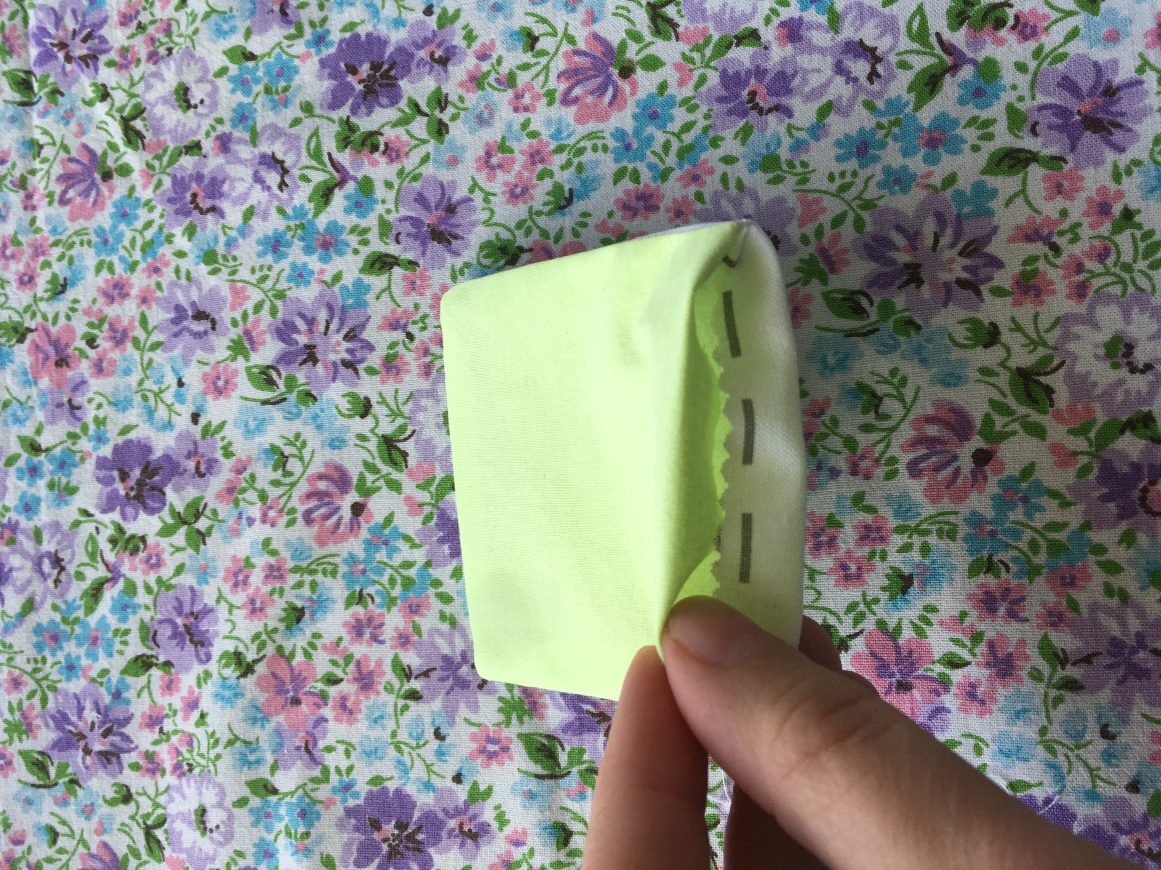 Nyní si dílek vyžehlíme. Po vyžehlení zahneme přečnívající plátno u otvoru směrem dovnitř.