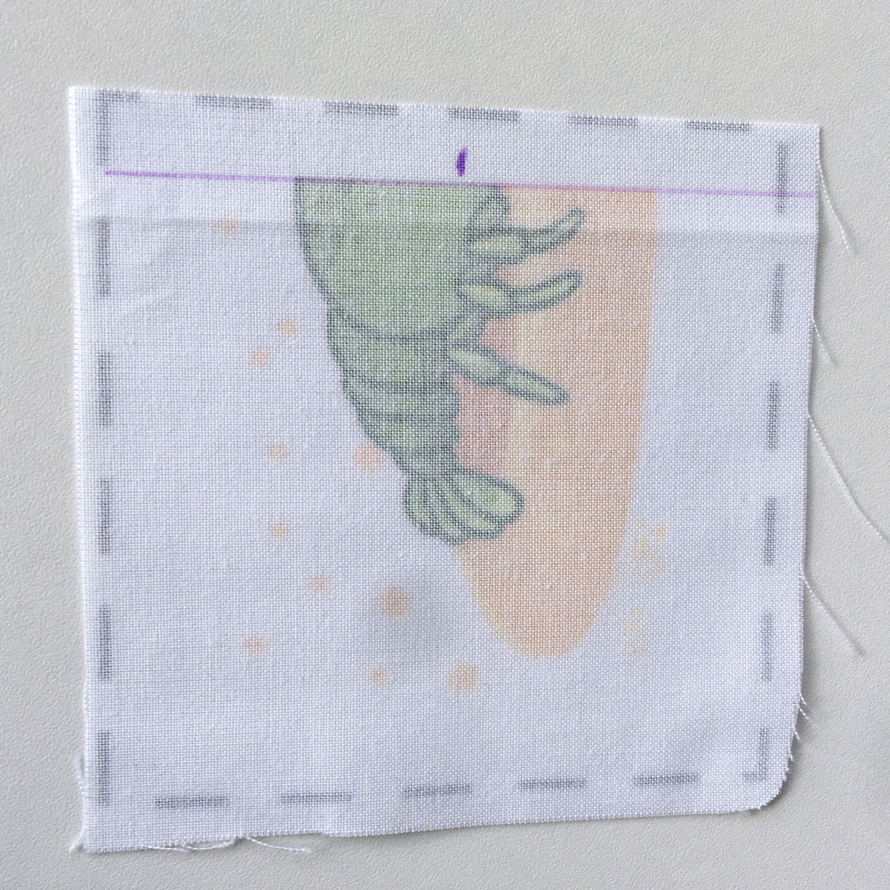 Sešíváme po obvodu ronofixu. Pokud máme dobře položený a zažehlený ronofix, pak bude steh pěkně lícovat s okrajem orázku, který je na panelu natištěný.