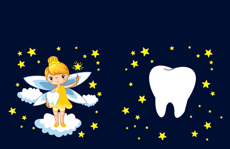 Set na zoubkovou vílu na tmavě modrém pozadí v růžových šatičkách