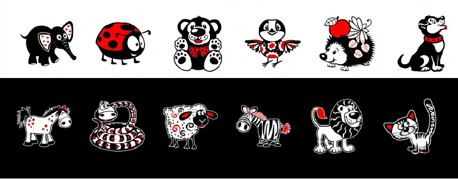 1 ks leporelo na černé o rozměru cca 62x12 cm, čtvereček leporela má cca 10cm. Materiál: 100% Bavlněné plátno
